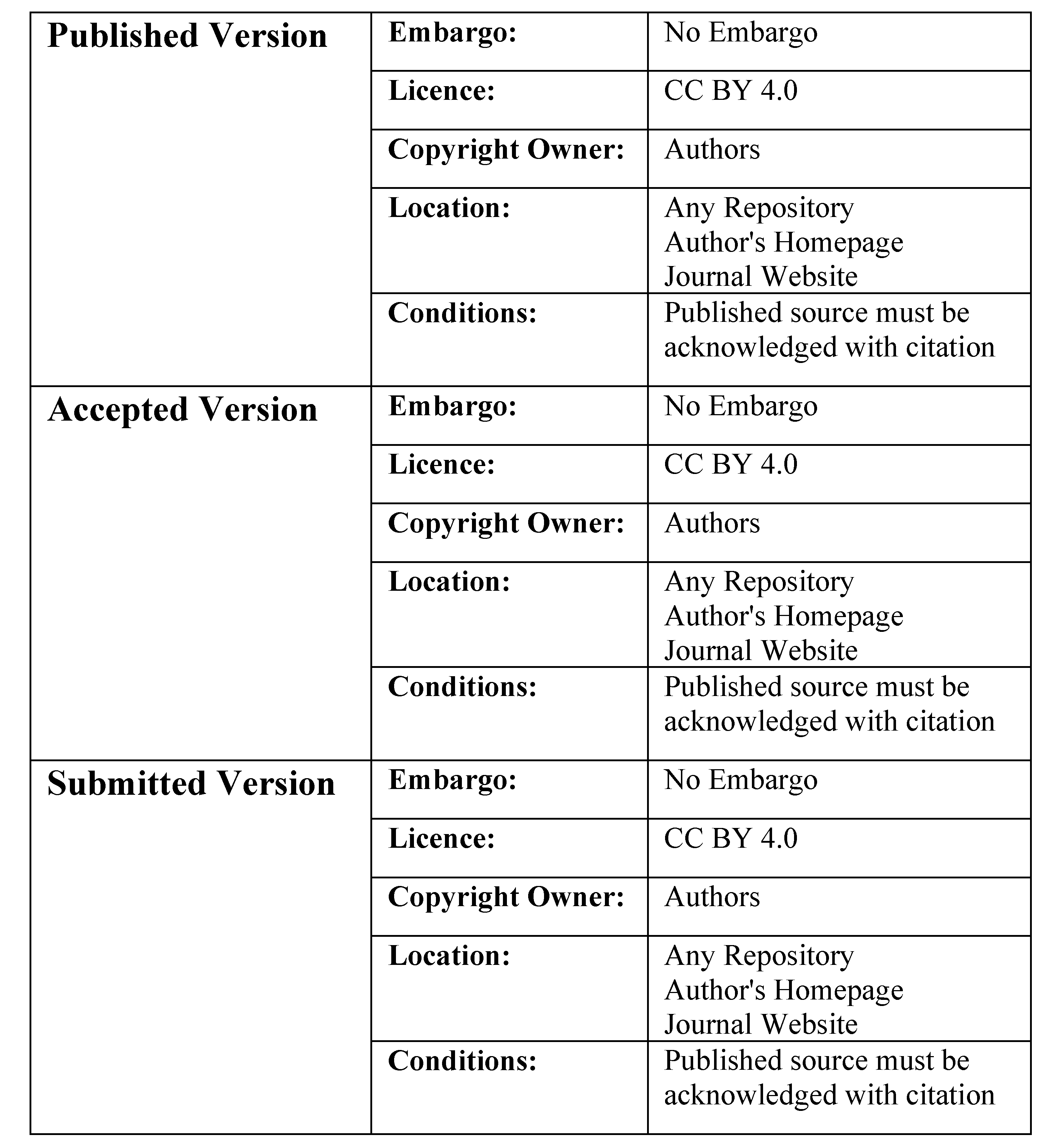 The Proceedings of the International Conference of Contemporary Affairs in Architecture and Urbanism-ICCAUA has a policy that allows authors to submit all versions of their articles to any repository they choose. The open-access options allowed by the journal's policy are listed below based on the version of the article: